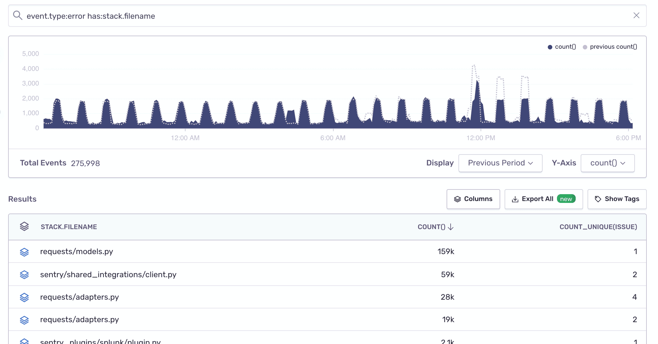 To find out which files in your codebase are generating the most errors, run the following query in Discover: