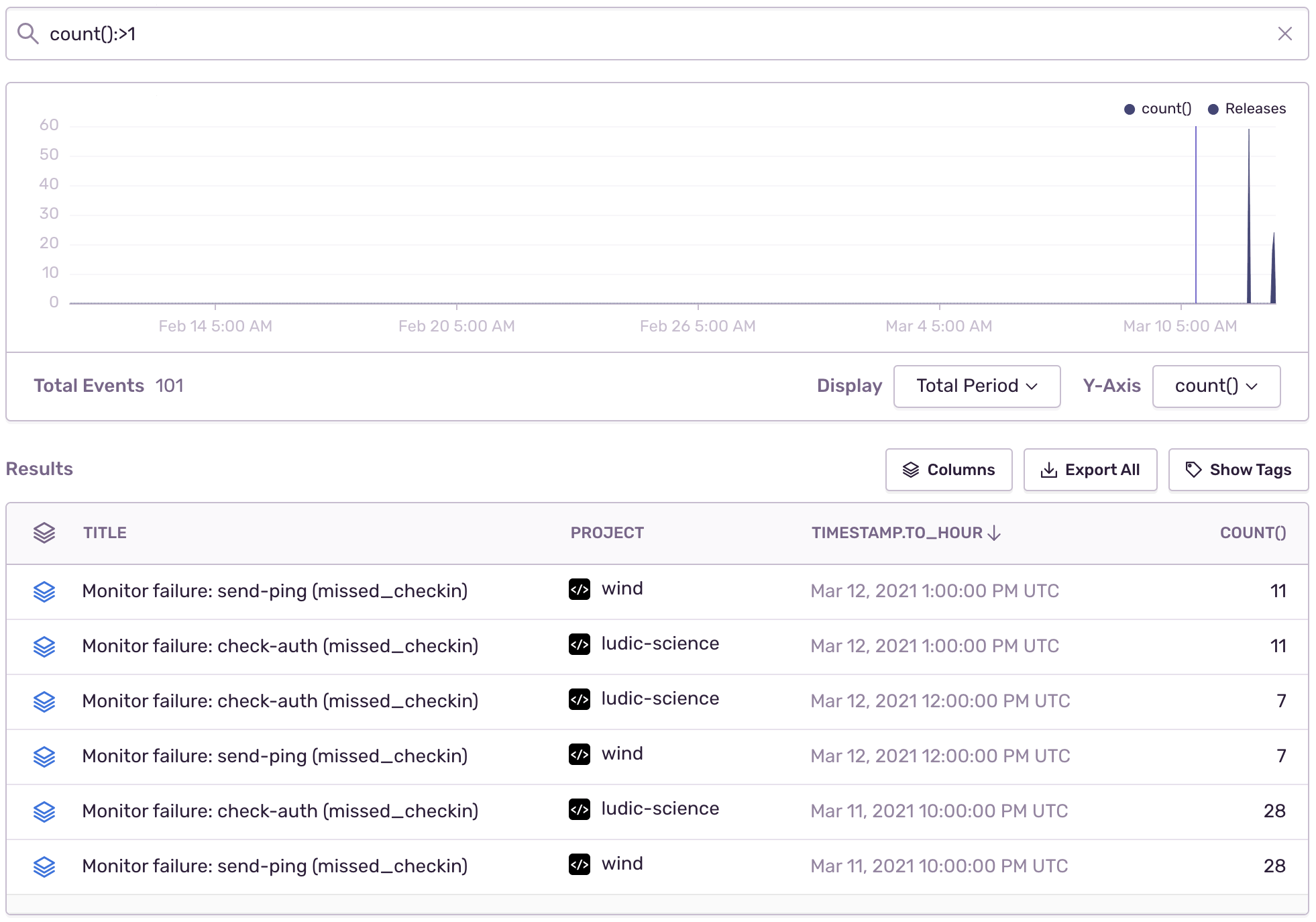 From here you can add a release as a filter and change the columns to count() and title to see similar errors. Then you can click the "Open Group" icon to drill down to individual events. You can also open the release in Releases from the "Results" table.